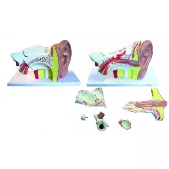 Este modelo anatómico muestra en detalle el oído externo, medio e interno. Con el objetivo de estudiar mejor su funcionamiento, este modelo anatómico de la oreja izquierda es tres veces el tamaño de una real. La maqueta se divide en 6 piezas separables que le permitirán analizar las diferentes partes del oído detalladamente. Estas 6 piezas son: el laberinto con el estribo, la cóclea, el nervio vestibuloclear y las dos partes óseas, que permiten cerrar el oído medio y el interno.