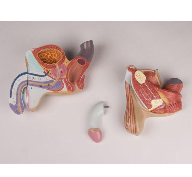 Este modelo de órgano genital masculino tamaño natural se compone de 4 partes desmontables. La maqueta está recortada en el plano sagital con el fin de observar más a detalle las estructuras interna y externa. Las partes removibles comprenden dos mitades del pene mostrando los cortes mediales y transversales, además de dos mitades del sistema reproductor masculino.
