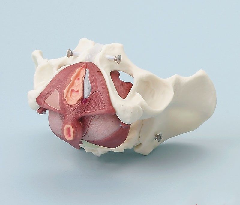 Este modelo a tamaño natural está formado por la cadera, el sacro, el cóxis y el suelo pélvico. El suelo pélvico está fabricado a partir de una material sintético flexible, sobre el cual cada estructura ha sido pintada.