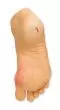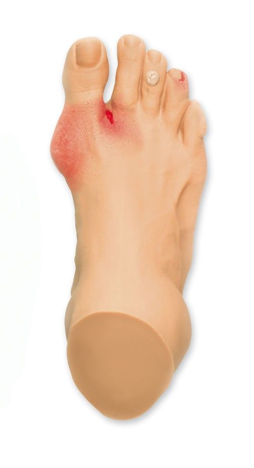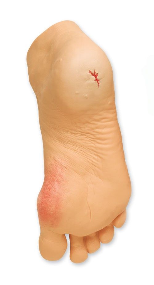 Este modelo de lesiones en los pies R10035 Erler Zimmer es una representación perfecta de un pie humano, muy realista, a tamaño natural y pintado a mano. Muestra las siguientes afecciones: un juanete, callo, cuerno, inflamación de la uña, una herida abierta, y la piel seca y agrietada.