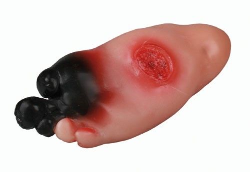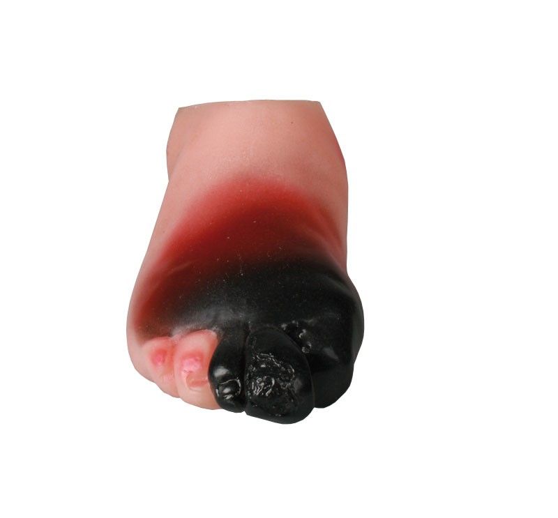Este modelo de pie diabético gravemente gangrenado R10067/1 Erler Zimmer es la representación de las graves consecuencias que la diabetes puede tener. A tamaño natural, el pie representa varios síntomas graves característicos: un dedo amputado, una deformidad del pie de Charcot, y gangrena grave e irreversible.