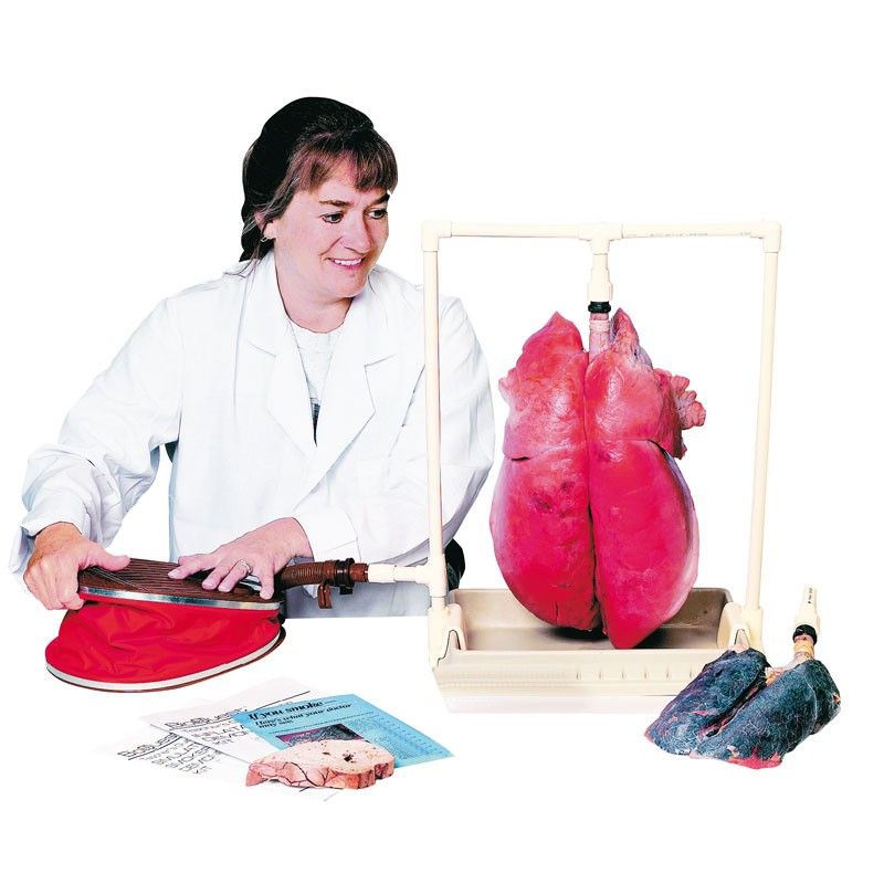 Colgado de un soporte de fijación, el pulmón está conectado por la abertura de la tráquea a una bomba, simulando así los movimientos de inspiración y espiración gracias al oxigeno soplado en el sistema pulmonar. Más cercano al realismo, este modelo de pulmón de cerdo ofrece la posibilidad de simular de manera eficaz y lúdica el proceso de respiración delante de un grupo de alumnos.