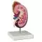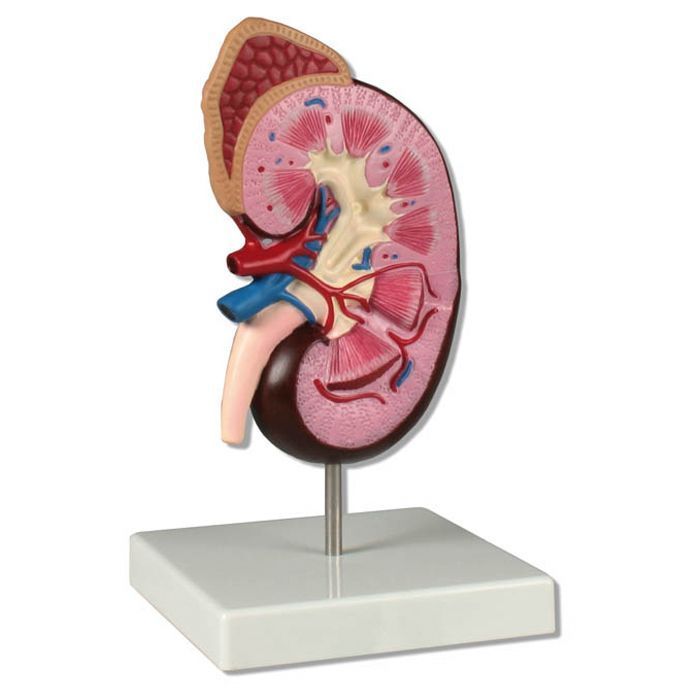 - Este modelo muestra las estructuras siguinetes: pelvis renal, médula renal, cáliz, corteza renal, arteria y vena renal, uréter y glándula suprarrenal