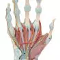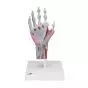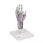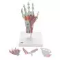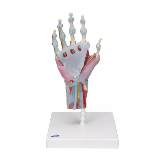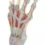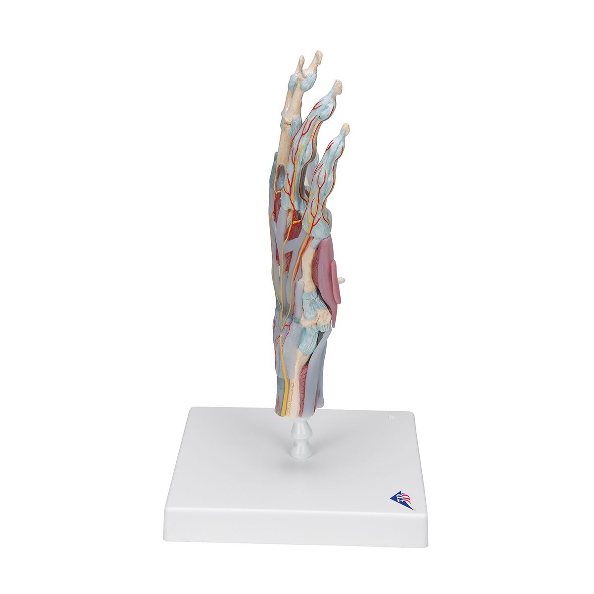 Este modelo de alta calidad consta de 4 partes y muestra todos los huesos, músculos, tendones, ligamentos, nervios, arterias y venas de la mano y el antebrazo inferior.