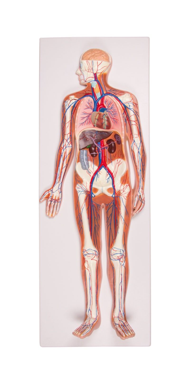 Este modelo del sistema circulatorio en relieve 90 cm G230 Erler Zimmer ofrece una visión del conjunto del aparato, presentando los principales órganos vitales y las extremidades del cuerpo humano, así como la estructura ósea. Son visibles: el corazón, los pulmones, el hígado, los riñones, el bazo, el cerebro, el ojo y una parte de los intestinos. La circulación pulmonar esta detalladamente diseñada, así como el pericardio del corazón con sus válvulas y atrio.