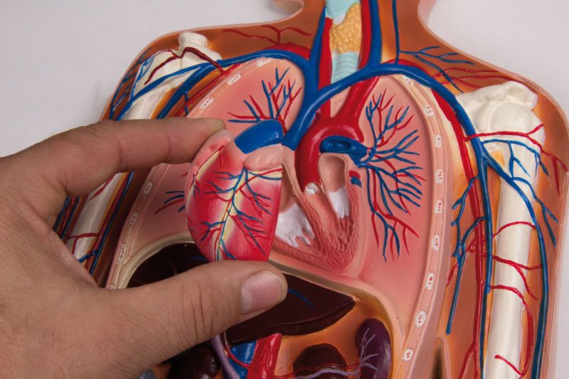La parte frontal del corazón se puede retirar para observar la estructura interna. La presencia de la osatura y de la red situada en relieve en relación a ésta permite una comprensión tridimensional del camino seguido por los vasos sanguíneos.
