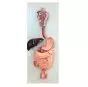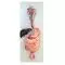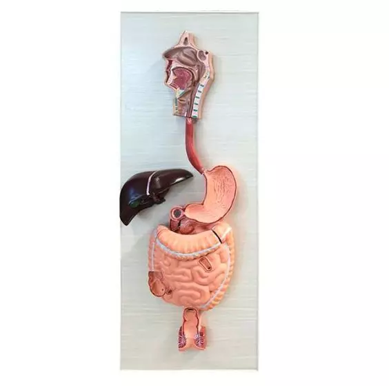 Este modelo anatómico del sistema digestivo tamaño natural expone en tres partes el tubo digestivo humano desde la cavidad bucal al recto. Esta maqueta del sistema digestivo es completa y facilita el aprendizaje de las partes del cuerpo humano. La cavidad bucal, la faringe y la primera parte del esófago se encuentran diseccionadas en el plano sagital. El hígado, la vesícula biliar y el páncreas están expuestos para poder examinar mejor las características internas. El estómago está abierto en el plano frontal para observarse de una mejor manera. Lo mismo sucede con el duodeno, el ciego, una parte del intestino delgado y el recto, los cuales están abiertos con el fin de exponer su interior.