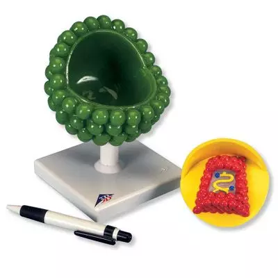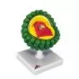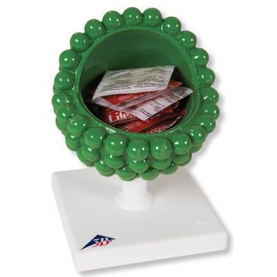 Este modelo del virus del SIDA L40- 3B Scientific hecho en PVC es una representación del virus, tal como se puede observar con un microscopio, es decir, ampliado millones de veces. Cabe señalar que, esta replica muestra la envoltura lipidíca externa (en verde) y un corte en el modelo permite ver las cápsides (en rojo), así como el ARN viral en su centro (serpiente amarilla).