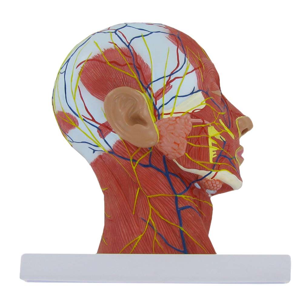 El modelo en relieve de media cabeza Mediprem es ideal para aprender acerca de todas las partes de la cabeza. Es un modelo anatómico bastante completo que reconstruye de manera perfecta la cabeza humana. La parte interior y exterior no posee las mismas características. En efecto, en la parte externa se pueden ver los vasos, los músculos y los huesos importantes de la cabeza. En la parte interna, puede observar las cavidades nasales, faríngeas y bucales. Igualmente se encuentran representados el cerebro, la tráquea y las cervicales.
