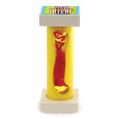 El tubo es una representación realista de una arteria obstruida por una placa que se forma sobre la pared arterial cuando el colesterol es demasiado elevado. A la manera de un reloj de arena, es posible girar el tubo para observar la circulación de la sangre en el plasma sanguíneo,o en nuestro caso la circulación de la sangre en la artería será más despacio o parará por completo.