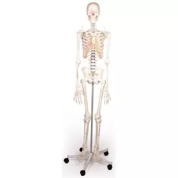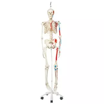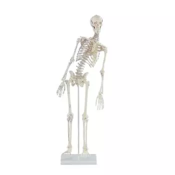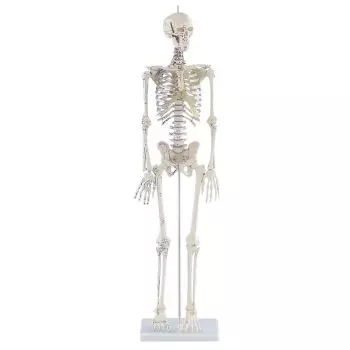 La anatomía es la ciencia encargada del estudio de las diferentes partes de los organismos vivos. El esqueleto humano desarticulado, es un ejemplo del armazón rígido que sostiene los músculos y los órganos, es estudiado por médicos y futuros médicos. Interviene en tres funciones fundamentales: el soporte de los músculos, la protección de las vísceras y la movilidad de todo el cuerpo. En los humanos, el esqueleto humano se compone de 206 huesos interconectados por las articulaciones. El esqueleto anatómico reproduce fielmente nuestro esqueleto. Con respecto al esqueleto anatómico, podrá elegir entre diferentes modelos dependiendo del uso que desee hacer del esqueleto anatómico, modelos de tamaño real, modelos a escala media o incluso modelos con ligamentos visibles. Marcas musculares para una mayor precisión en su aprendizaje de la anatomía humana, como el esqueleto miniatura shorty con músculos pintados, sobre soporte A18/6.