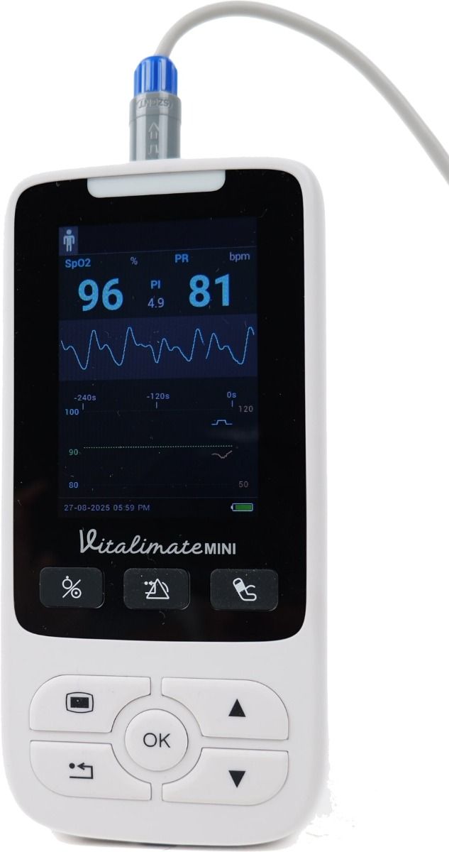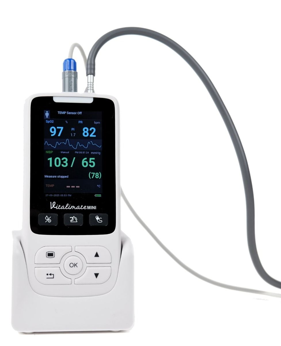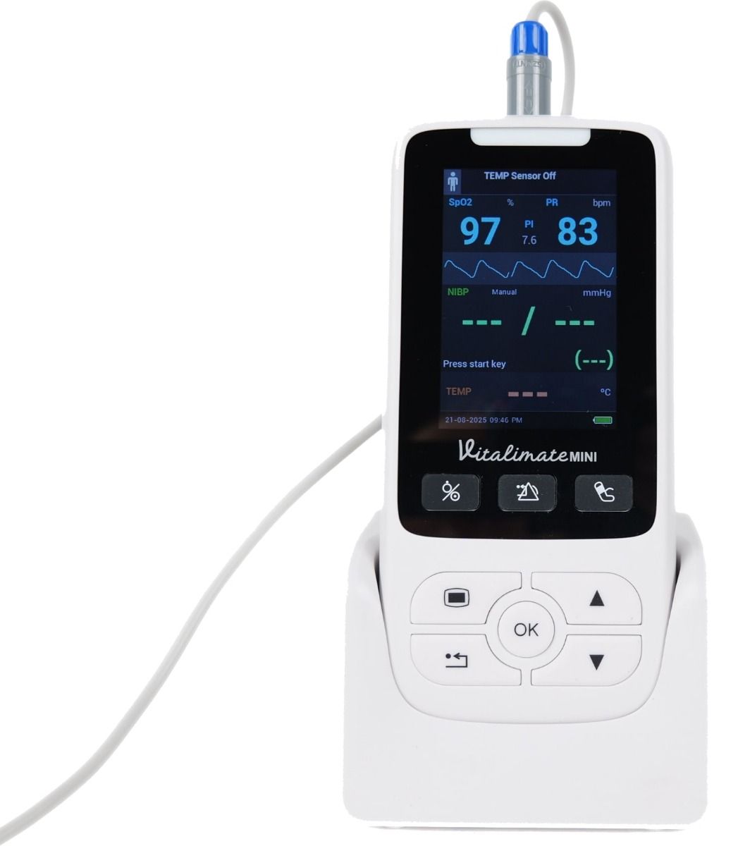 El Vitalimate Mini de Spengler ofrece una monitorización precisa y rápida de las constantes vitales gracias a su tecnología avanzada y su tamaño compacto. Este monitor multiparámetro mide SpO₂, frecuencia cardiaca y, según la versión, presión arterial no invasiva (PSNI), satisfaciendo las necesidades de cualquier persona que busque una herramienta fiable, portátil y fácil de usar.