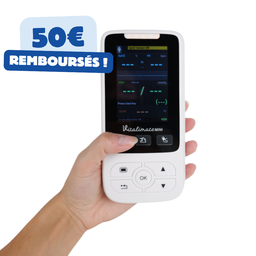 Reciba 50 € de devolución en un plazo de 30 días por la compra de un Vitalimate Mini NIBP + SpO₂, realizada entre el 3 de noviembre de 2025 y el 31 de enero de 2026.