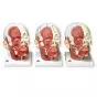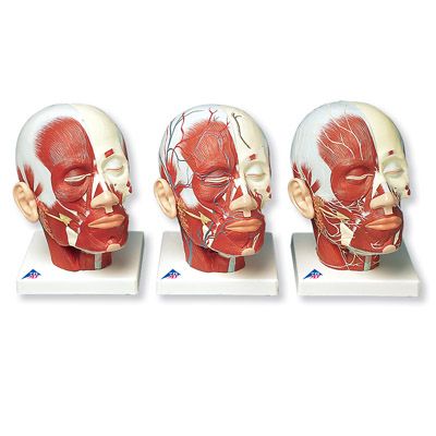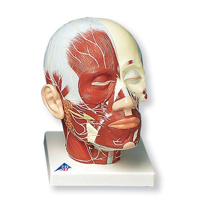 Una representación de la musculatura superficial de la cabeza y el cuello con: