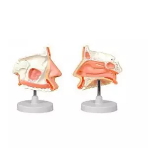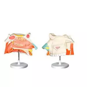 Nariz con cavidades paranasales, dividida en 5 partes. El modelo permite visualizar la estructura de la nariz en una ampliación de 1,5, con las cavidades paranasales en el interior de una mitad derecha superior del rostro.