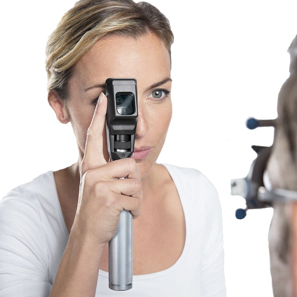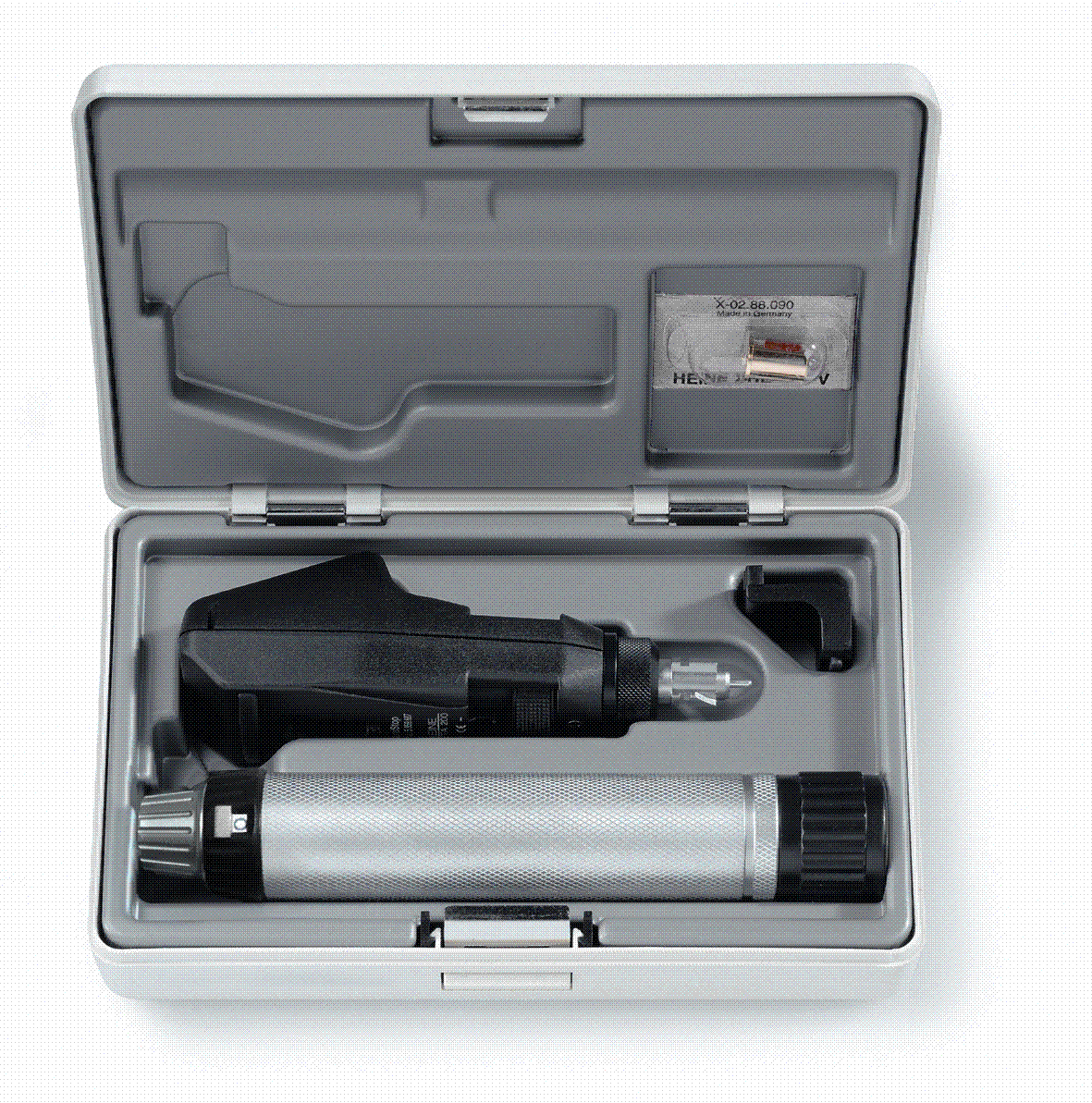El oftalmoscopio con la óptica asférica superior. Sistema óptico único. HEINE realiza de forma ideal el principio de Gullstrand. (Separación del haz de iluminación del de observación). Se suprimen los reflejos de la córnea y del iris. También en pupilas estrechas, se ve completamente la zona iluminada de la retina.
