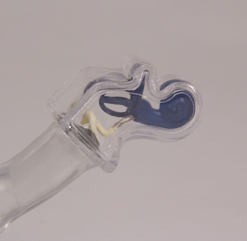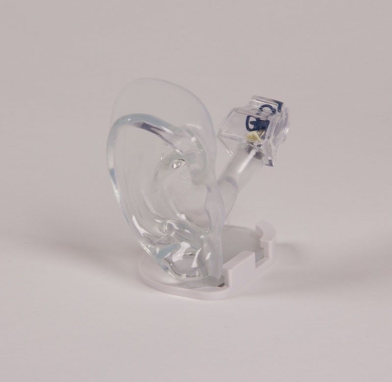 Este modelo de oído humano transparente E133 Erler Zimmer representa la estructura visible y no visible del oído, fabricado con un material transparente para observar más fácilmente sin necesidad de realizar a un corte. Están representados el conducto auditivo, el tímpano, el estribo, el yunque, el martillo, y la cóclea en forma de caracol, todo fácilmente observable.