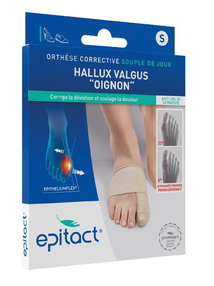 Laórtesis correctiva diurna para hallux valgus Epitact ayuda a mantener el dedo gordo del pie en una posición más natural a la vez que proporciona un confort apreciable al caminar. Su diseño patentado ayuda a alinear el dedo, reduce la presión sobre la articulación y protege la zona sensible alrededor de la protuberancia ósea, a menudo conocida como "juanete", incluso cuando se lleva calzado cerrado.