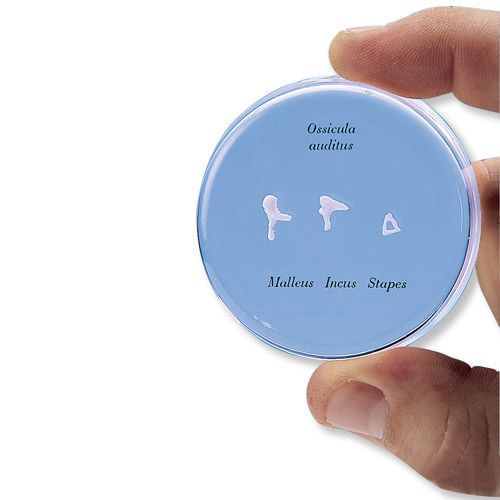 Los osículos auditivos humanos están incrustados individualmente en un plástico transparente.