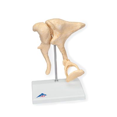Llamamos cadena de huesecillos u osículos a los tres huesos más pequeños del cuerpo humano, unidos entre sí mediante articulaciones. Se encuentran en el oído medio. Malleus (Martillo), Incus (Yunque) y Stapes (Estribo). Su función es la de transmitir el sonido entrante desde el tímpano a través de la ventana oval hasta el oído interno, provocando así una intensificación mecánica del sonido. En caso de que nos veamos sometidos a ruidos muy fuertes, es importante proteger el oído interno de daños permanentes. Esto es posible gracias a un reflejo que desencadena cierta actividad muscular (M. estapedio). Como consecuencia de esto, el estribo adopta una posición levemente ladeada, de modo que la intensidad del sonido puede transmitirse sólo por partes. Cuando se producen movimientos demasiado fuertes de la cadena de huesecillos (como por ejemplo cuando tosemos o estornudamos) hay otro músculo que tiene una función protectora (M. tensor del tímpano), su tendón se inserta en el martillo y tensa el tímpano. Una enfermedad típica, que afecta a los osículos del oído y que conlleva su rigidez y la consecuente pérdida de audición, es la otosclerosis. Nuestra maqueta es una réplica aumentada de piezas óseas originales utilizando el Micro-TC