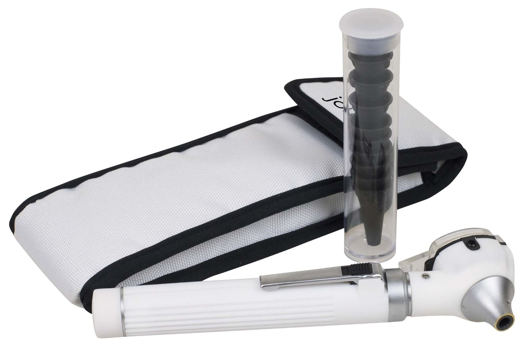 El kit completo incluye todos los accesorios necesarios para su uso inmediato: 10 espéculos auriculares (5 de Ø 2,5 mm y 5 de Ø 4 mm), un estuche blando para facilitar el transporte, así como 2 pilas LR6 para una mayor autonomía. Su diseño ergonómico asegura un agarre cómodo e intuitivo, incluso durante consultas frecuentes.
