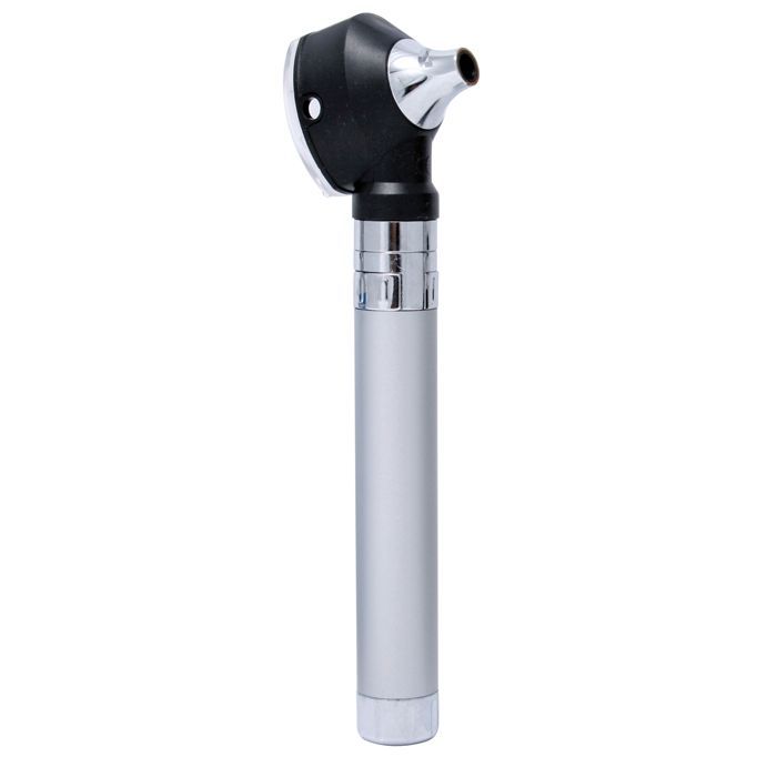 Otoscopio Eclipse F.O. plata - Cabezal bi-material, ABS y polipropileno - Lupa giratoria: Acrílico, 2,5 veces de aumento - Longitud total: 16,5 cm - Peso: 300 g - Garantía: 1 año.