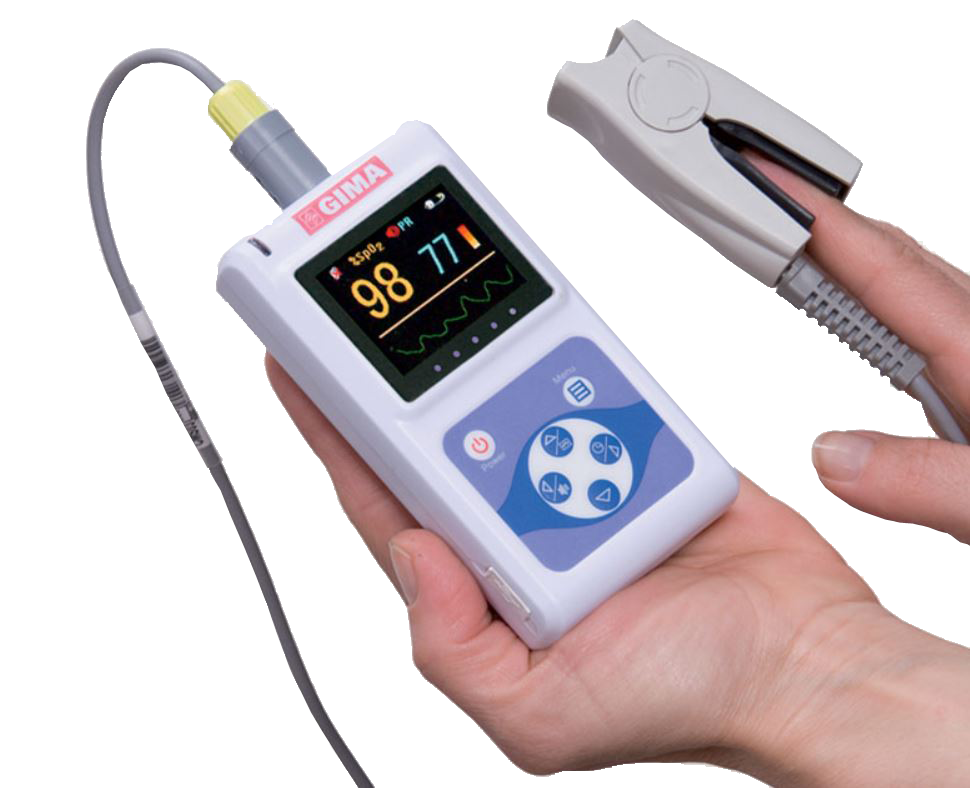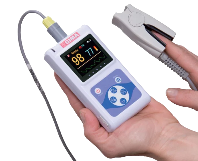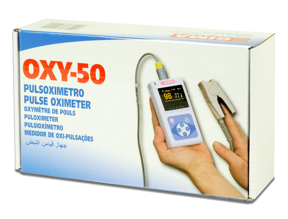 El oxímetro de pulso OXY-50 de Gima es un oxímetro digital de bolsillo utilizado para medir la saturación de oxígeno en el pulso y la frecuencia del pulso a través del dedo mediante su sensor de tamaño adulto.