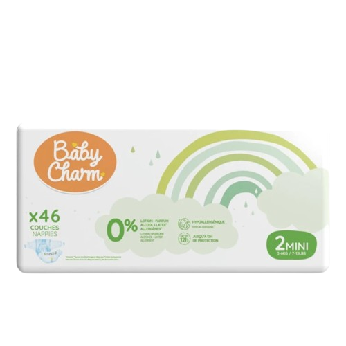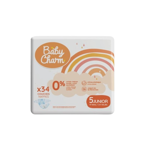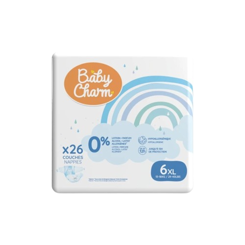 Descubre los pañales superabsorbentes Baby Charm, diseñados para ofrecer comodidad y tranquilidad durante todo el día y acompañar al bebé en cada etapa de su crecimiento. Su núcleo ultrafino y muy absorbente garantiza una absorción rápida y eficaz, sin dejar de ser discreto bajo la ropa.