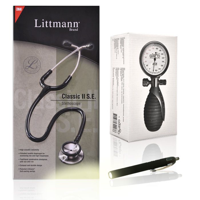 Pack de diagnostico estudiante Littmann Girodmedical Violeta - Tensiometro aneroide Easy 2 - Fonendoscopio 3M Littmann Classic II S.E. Negro - Lámpara de bolsillo negra PenLED