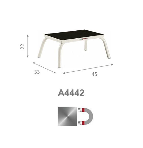 El peldaño metálico Ecopostural A4442 con revestimiento antideslizante negro garantiza la seguridad de los pacientes al subir y bajar de la mesa de exploración.