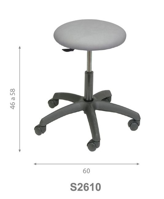 El taburete Ecopostural S2610, montado sobre una base negra con ruedas, tiene un asiento giratorio que puede regularse en altura de 46 a 58 cm mediante un resorte de gas. Práctico y flexible, facilita los desplazamientos por la sala de reconocimiento.
