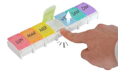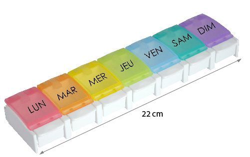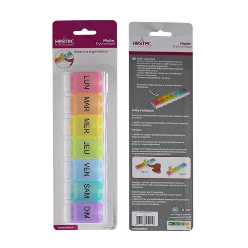 El pastillero Hestec, es muy práctico y fácil de usar. Esta equipado de 7 compartimentos extra largos para acomodar los medicamentos de cada día de la semana y tiene las siguientes dimensiones: 23 x 4.6 x 2.8 cm.