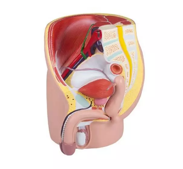 La estructura se separa en 4 partes, es decir, los diferentes elementos de la pelvis anatómica masculina Mediprem. Éstos consisten, por un lado, en el pene dividido en secciones medial y transversal. Por otro lado, la mitad del sistema reproductivo con una dissección abierta de un testículo. De esta forma, se muestra a detalle la estructura interna de la anatomía pélvica masculina. Para lograr un mejor estudio, la mitad de los órganos genitales es removible.