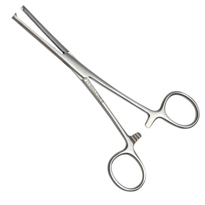 Esta pinza hemostática curva Bengolea con dientes es una herramienta utilizada para la realización de pequeñas cirugías de precisión. La pinza está destinada a un sólo uso durante una sola operación.