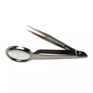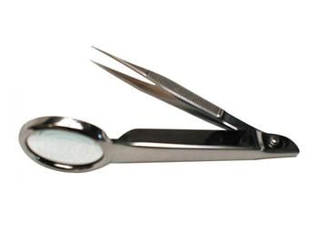 La pinza es un instrumento de referencia utilizado por el dentista en sus consultas. Esta pinza con lupa de Comed cuenta con extremos muy finos para coger los objetos pequeños. Puede utilizarse para colocar elásticos durante la colocación de un anillo o agarrar las compresas estériles para introducir en la boca del paciente.