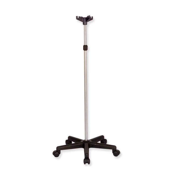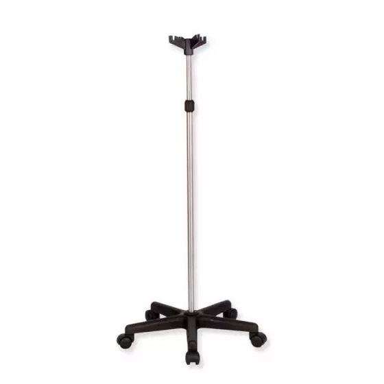 Porta suero Holtex ganchos plástico - Tubo redondo de acero inoxidable - Travesaños de plástico negro - 5 ramas con ruedas gemelas sin frenos - Altura ajustable de 120 cm a 215 cm - Peso: 3 kg