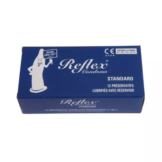 Preservativos Reflex Estándar Caja de 12 - Con depósito - Forma: Cilíndrica - Color: Natural - Probado electrónicamente: 100% - Embalaje individual - 12 piezas por caja