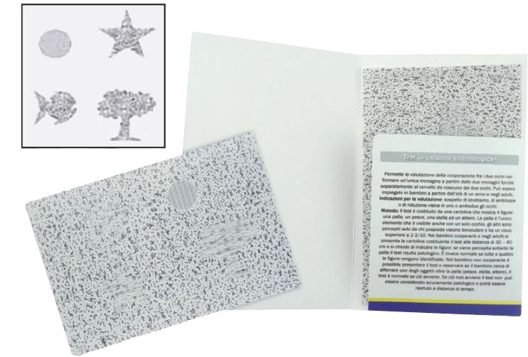 Esta herramienta de examen estereoscópico de Gima utiliza diferentes elementos para evaluar la estereopsis. Entre estos elementos se encuentran una pelota, un pez, una estrella y un árbol. Durante esta prueba, ambos ojos observan estas imágenes simultáneamente. Sin embargo, la pelota está diseñada para ser visible solo por un ojo. Esta característica permite evaluar la capacidad del cerebro para fusionar las dos imágenes y percibir la profundidad.