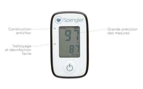 Robusto y ergonómico, el Spengler OXYGO tiene una estructura resistente a los golpes y un diseño liso que facilita su limpieza y mantenimiento. Su indicador de desaturación proporciona una alerta instantánea en caso de caída crítica de los niveles de oxígeno, mejorando la calidad del diagnóstico y la seguridad del paciente.