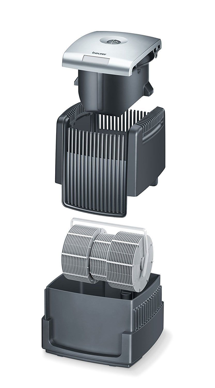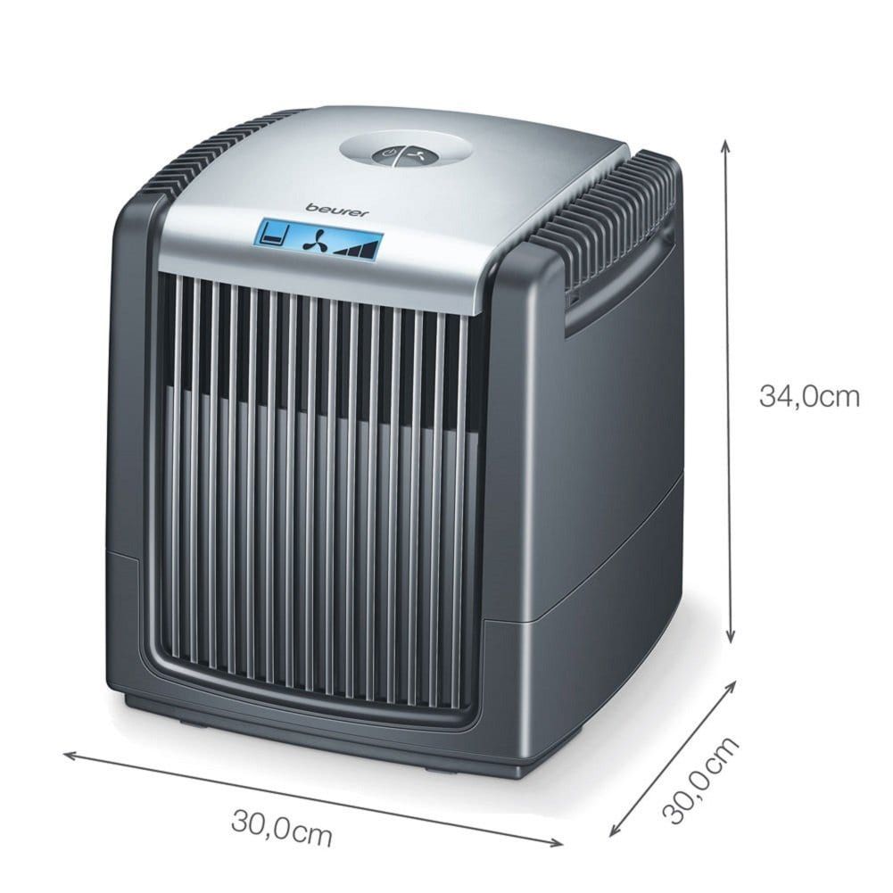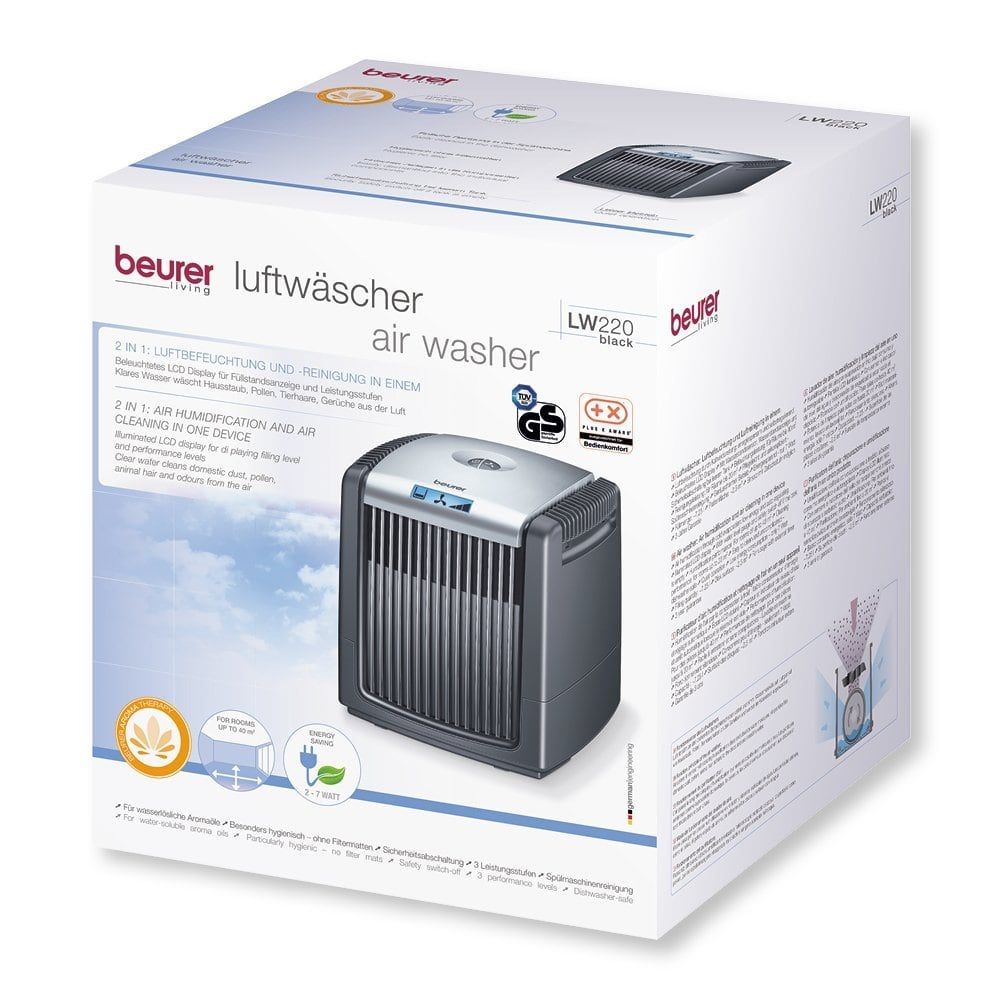 Purificador de aire Beurer LW 220 Negro Limpieza del aire :El agua lava el polvo, el polen, el pelo de animales y los olores del aire Para cuartos de hasta 40 m² Potencia 7 vatios 3 niveles de velocidad Tamaño del depósito (en litros) : aprox. 7,25