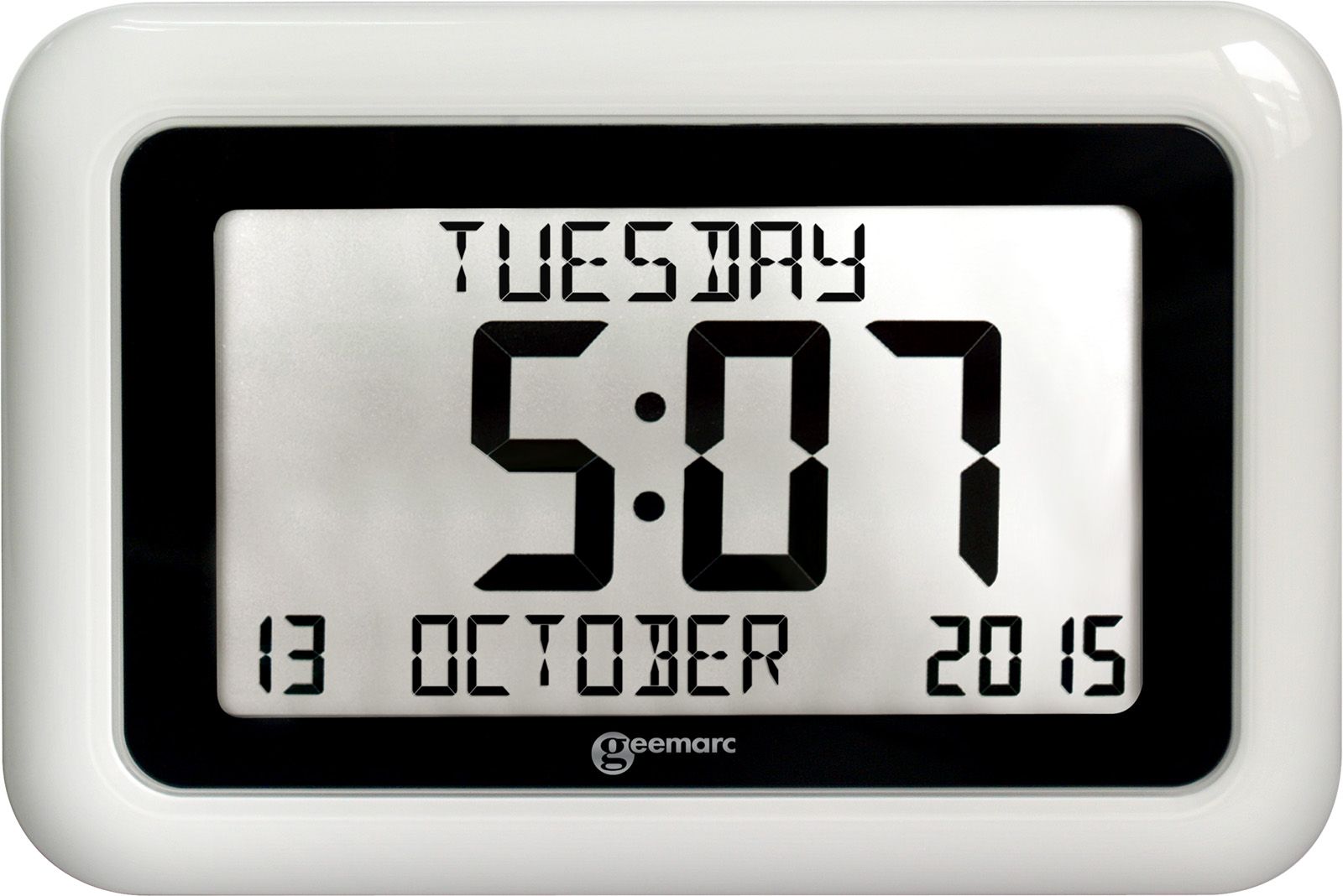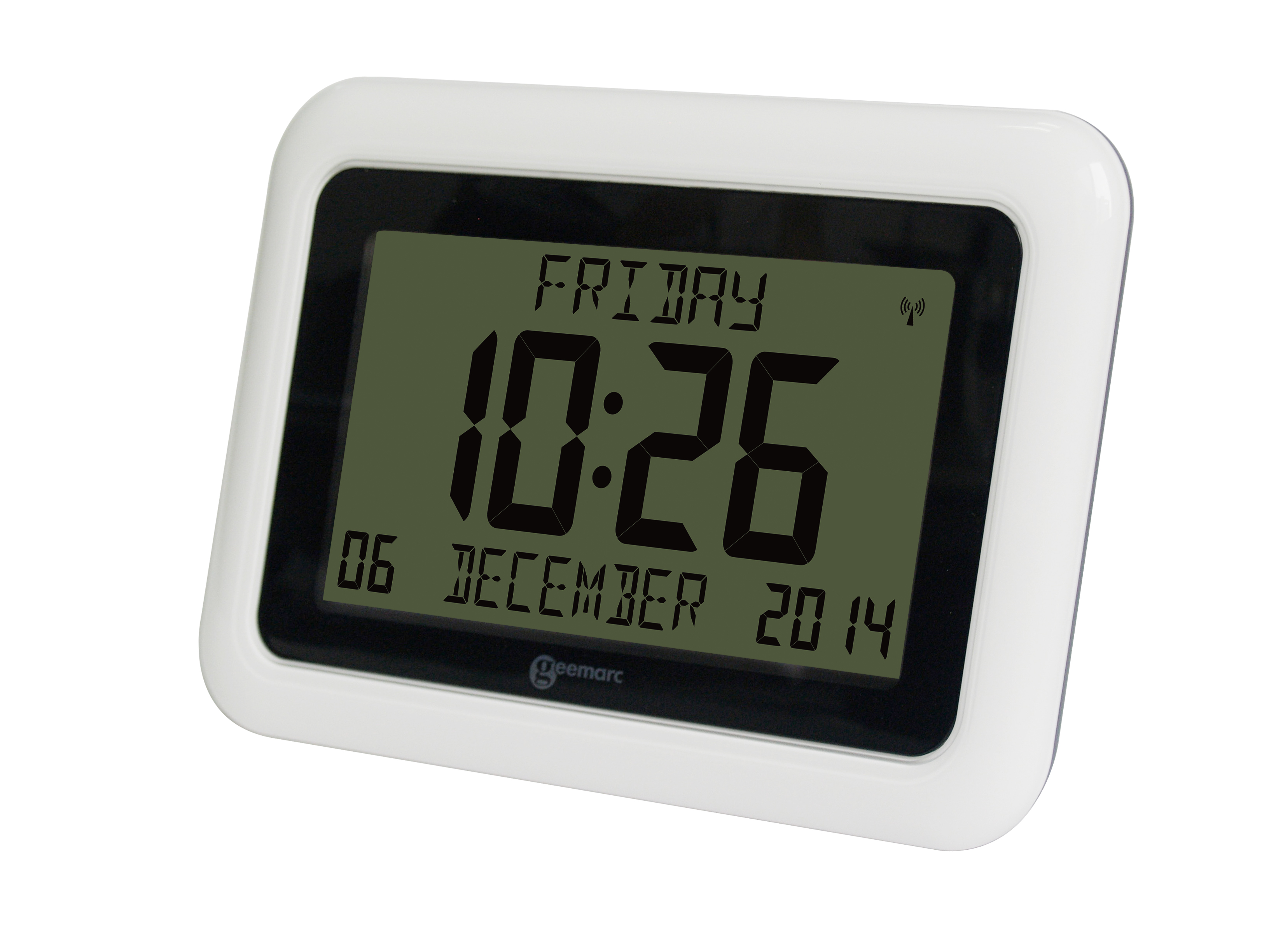 El reloj LCD VISO10 Geemarc se puede fijar a la pared o colocar sobre un mueble. Su pantalla digital muestra la hora así como la fecha con el formato: día de la semana, número, mes y año (ejemplo, lunes 1 enero 2017). El reloj es perfectamente visible tanto de lejos como de cerca, lo que lo hace perfecto para personas con problemas de vista.