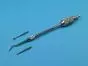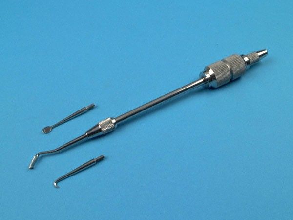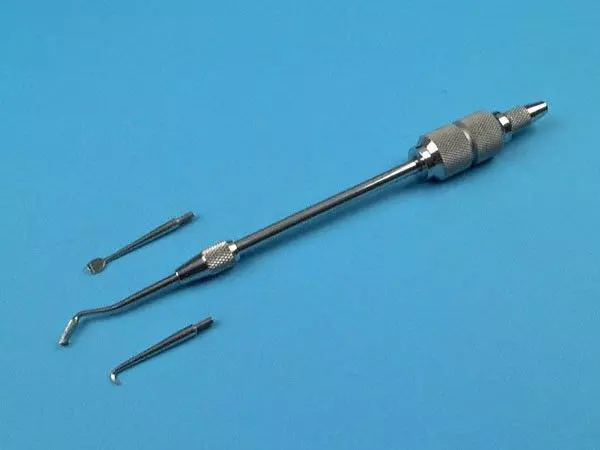 Instrumento en tres piezas para quitar coronas. La punta tiene forma de gancho. Se trata de un utensilio de calidad con 2 años de garantía