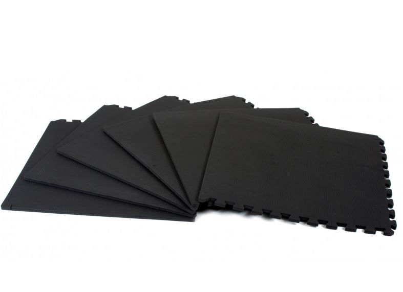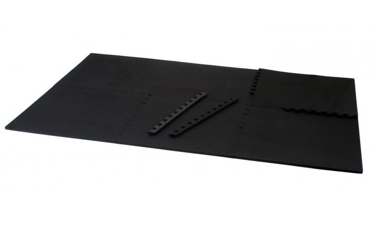 El set esta compuesto de 6 láminas de tapis de protección para el suelo que se ensamblan como piezas de rompecabezas con el fin de proteger el suelo de posibles abolladuras o lesiones, marcas de zapato o de aparatos que puedan afectar el piso del gimnasio o areas fitness.