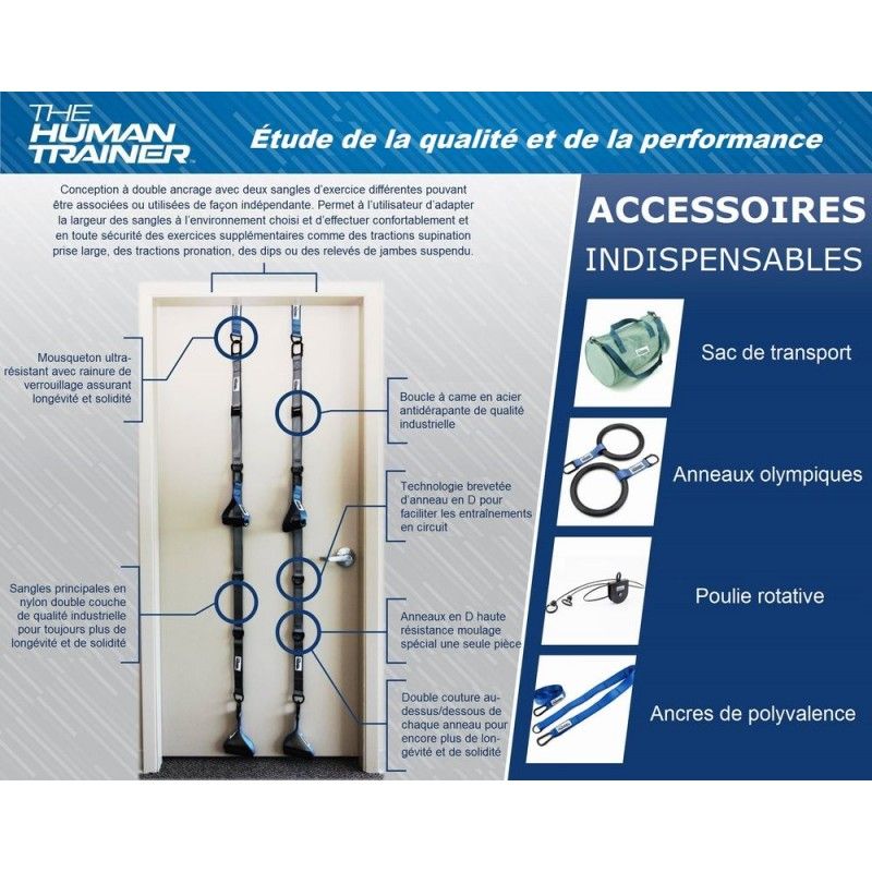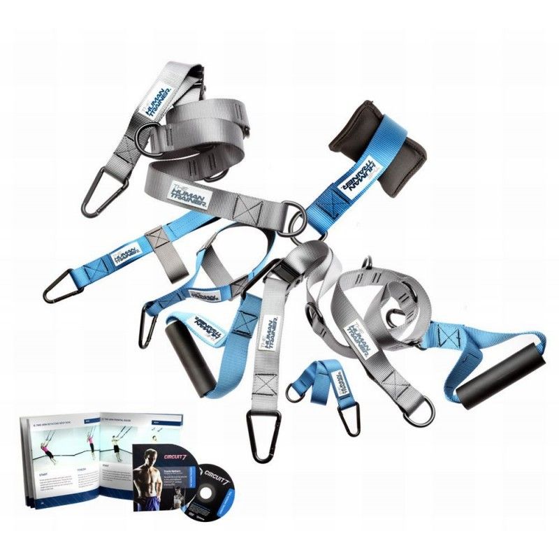 Set que incluye : 2 correas, 2 extensiones, 2 bloquea puertas, 2 asas, 2 sujeta tobillos, 1 DVD, 1 manua de uso.