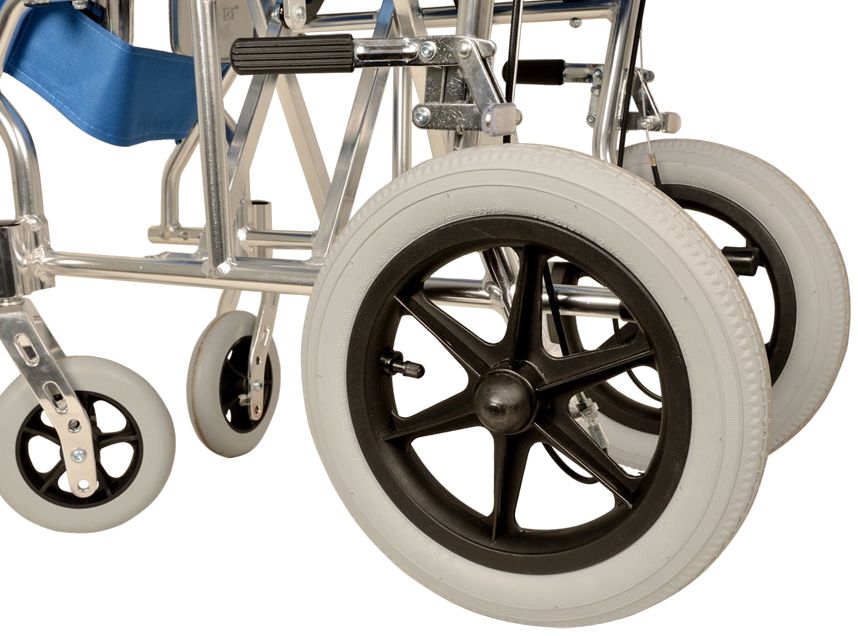 La seguridad es fundamental en el diseño de la silla de transferencia Queen. Las ruedas delanteras sólidas de 15 cm garantizan una estabilidad aumentada, mientras que las ruedas traseras neumáticas de 30 cm con frenos integrados ofrecen un control total sobre sus desplazamientos. Así, podrá moverse con confianza y seguridad, incluso en superficies difíciles.