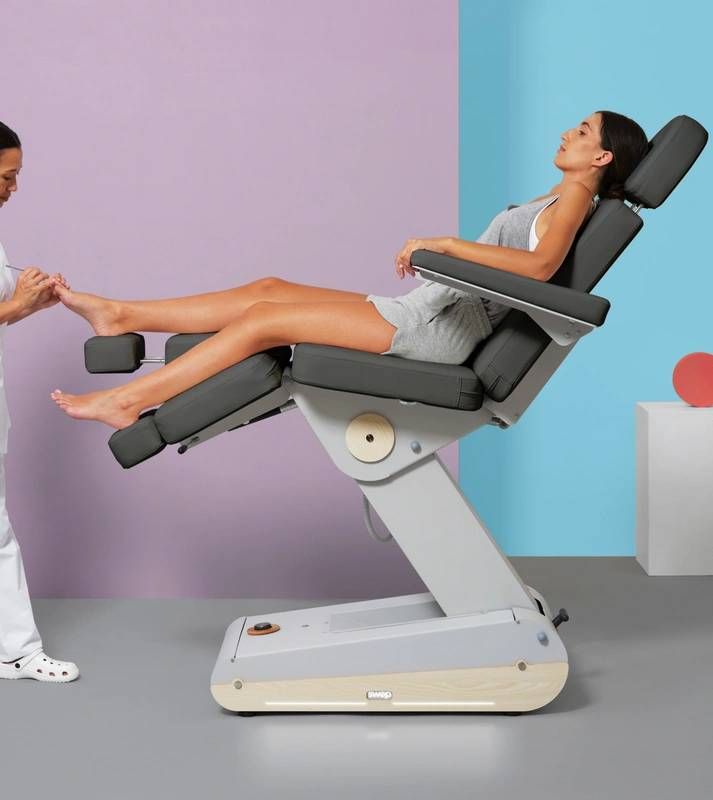 Los reposapiernas independientes, equipados con amortiguadores de gas accionados por palanca, garantizan un manejo suave y seguro. Su extensión integrada permite ajustar fácilmente la longitud para adaptarse al tamaño del paciente, garantizando comodidad y estabilidad durante toda la sesión. El sillón de podología también puede utilizarse en posiciones específicas, como la posición Antigravedad, para mejorar la circulación y reducir la tensión muscular.