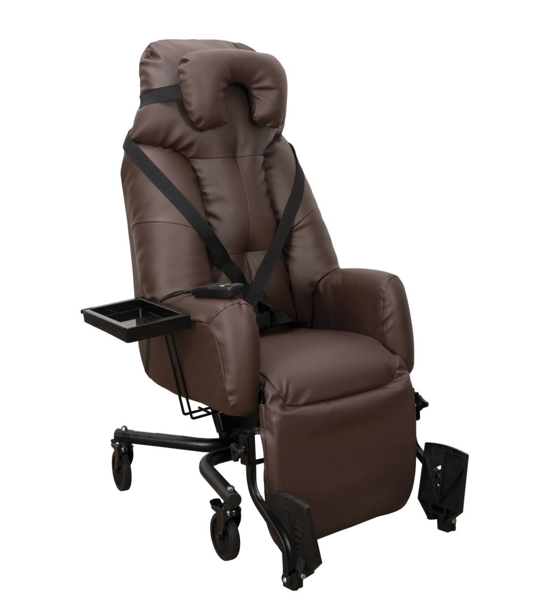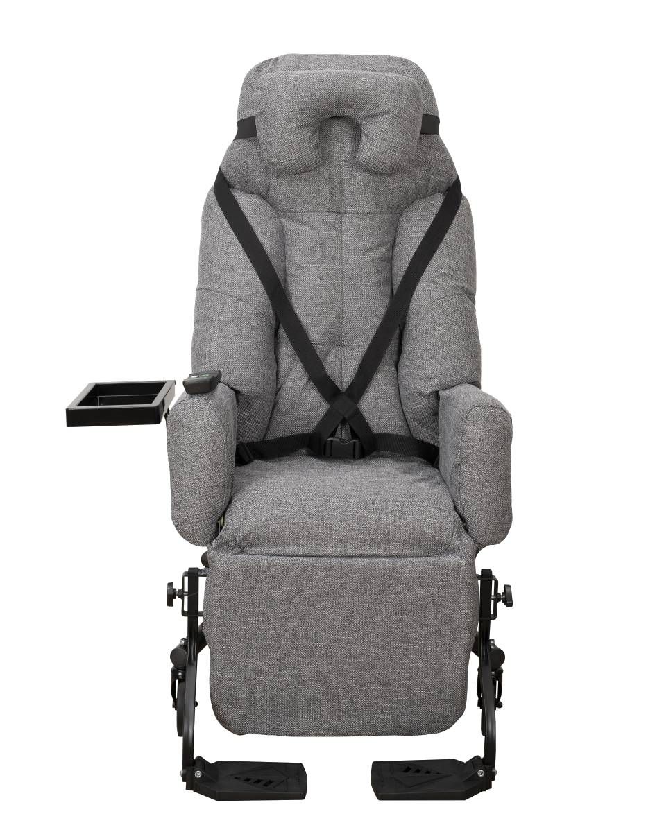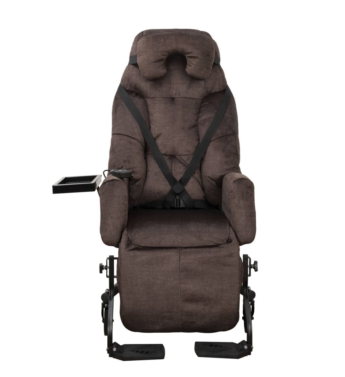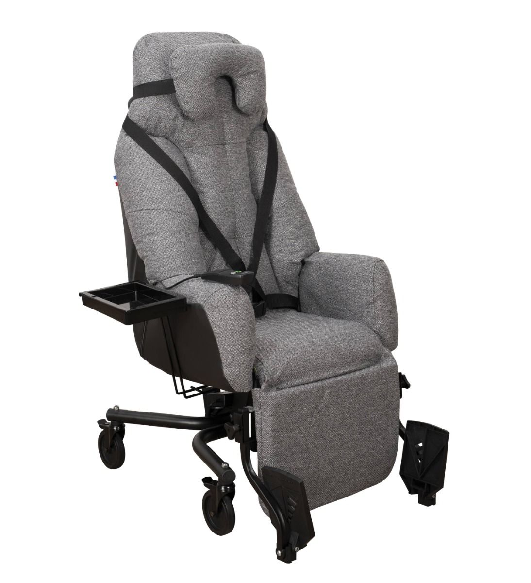 Su reposapiernas extensible se ajusta automáticamente al ángulo de inclinación del paciente, proporcionando un apoyo óptimo en posición semiacostada. La silla está equipada con una mesa lateral extraíble, un arnés de seguridad y una almohada cervical anatómica para un apoyo seguro.
