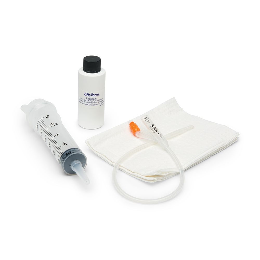 Este simulador para la cateterización femenina incluye maletín rígido de transporte, lubricante, catéteres, perilla de 50 cc, jeringa y manual de instrucciones.