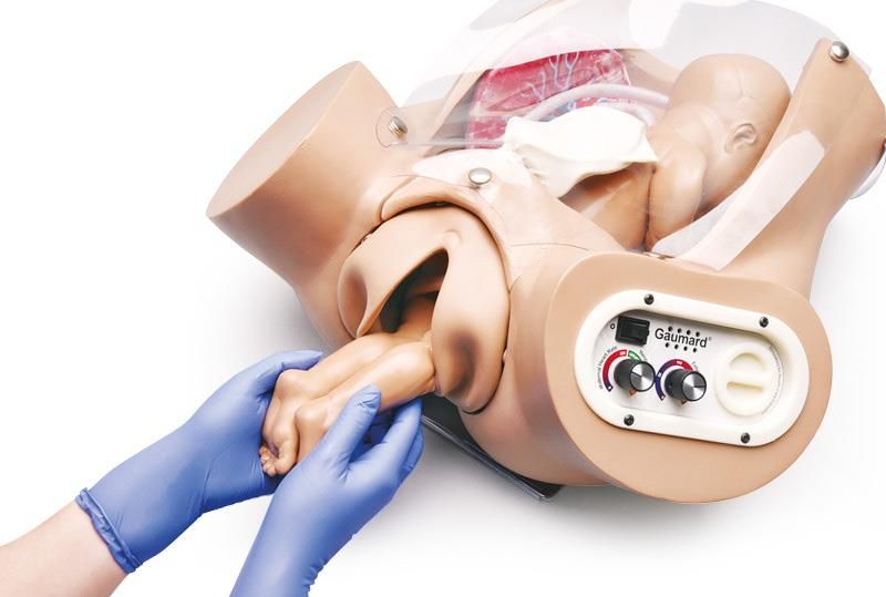 Funciones avanzadas: Puede escuchar los latidos cardíacos de la madre y del recién nacido, así como los llantos y gruñidos del bebé. Además, este dispositivo de simulación de nacimiento permite el cateterismo vesical con un flujo urinario variable, la colocación de la pinza y el corte del cordón umbilical, la expulsión de la placenta y la inserción de medicamentos por el recto.
