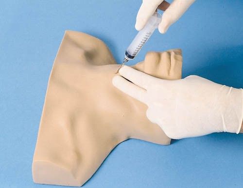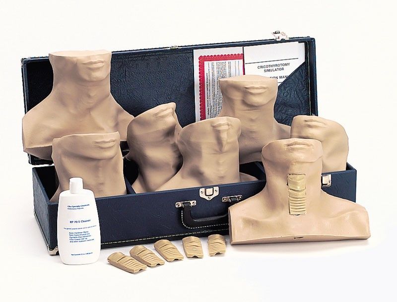 La operación consiste en cortar la membrana cricotiroidea. Este simulador de traqueostomía R10036 Erler Zimmer permite realizar esta maniobra de manera realista gracias a los puntos de referencia palpables en la garganta, el cartílago tiroides y cricoides. La nuez de Adán es fácilmente visible en un cuello tendido.